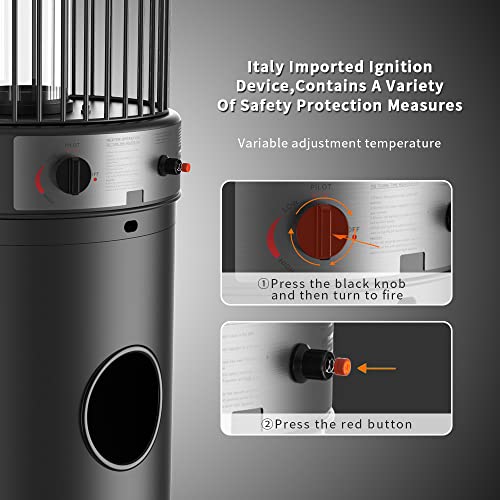 - 【4】Die Terrassenheizer mit Gas sind mit CE versehen und erfüllen die strengen EU-Sicherheitsstandards für die Herstellung. Die Gesamthöhe des heizpilze für die terrasse nach der Installation beträgt 2,21 m und das Gewicht beträgt 20 kg. Kann dem maximalen Gewicht des Zylinders von 15 kg standhalten. Zündmethode: piezoelektrische Zündung. Brenngeschwindigkeit Erdgas: Butan 945 g/h, Propan 928 g/h.