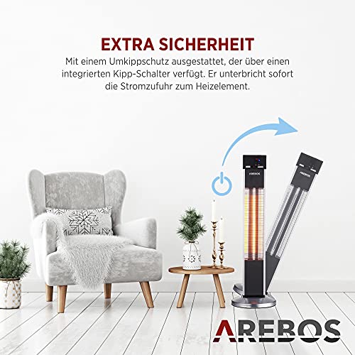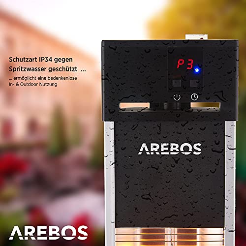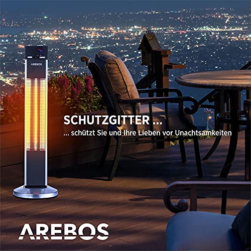 Arebos Infrarot Stand Heizstrahler 2000 W | mit Fernbedienung | IP34 Schutzart | Low-Glare-Technologie | 3 Heizstufen | Silber-Schwarz