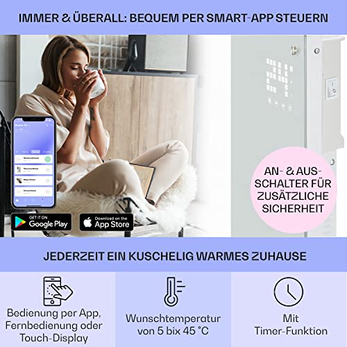 - EINFACHE STEUERUNG: Bediene unsere Heizgeräte bequem von der Couch aus über die Fernbedienung oder über die App. Mit dem integrierten einstellbaren Thermostat und mit der automatischen Abschaltfunktion kannst du deine Wunschtemperatur einstellen.